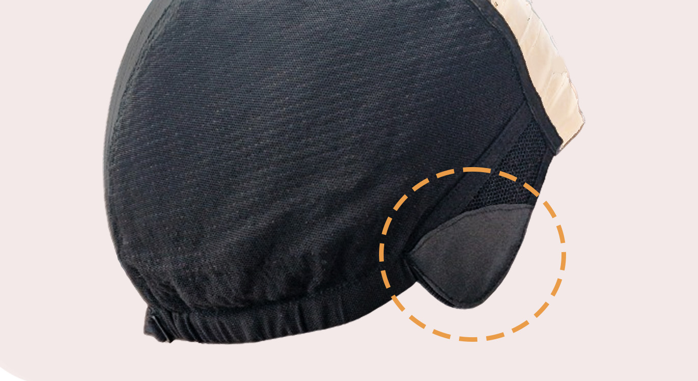 両サイドのアジャスターベルトで、頭周りの大きさの微調整が可能です。また、両面テープ接着面は両サイド部分だけでなく、えり足部分にもプラス。確実にフィットさせてズレを防ぐ工夫の一つです。