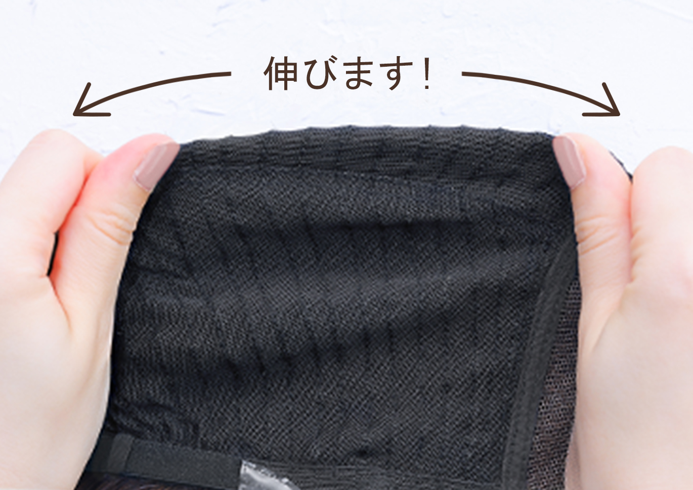 脱毛症や抗がん剤等による治療中は、髪の状態が大きく変化することがあります。医療用ウィッグ・レミーはこうした自髪の増減による頭のサイズ変化に対応するため、上下左右に伸び縮みするストレッチタイプのベースネットを採用しています。ネットは頭全体をやさしく包みこみ、締め付け感もなく快適な付け心地です。